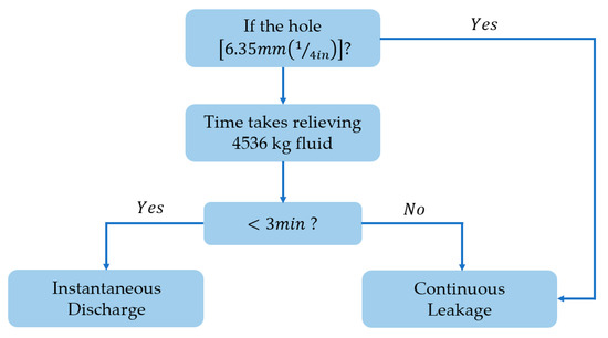 API 581 divides the consequences of equipment leakage into two types: instantaneous release and continuous leakage. Instantaneous release refers to the rapid discharge of fluid and continuous leakage is a long-lasting outward diffusion discharge. The judgment of the type of leakage depends on the size of the leak hole and the time taken to leak 4536 kg of liquid; the process is shown in Figure 2.