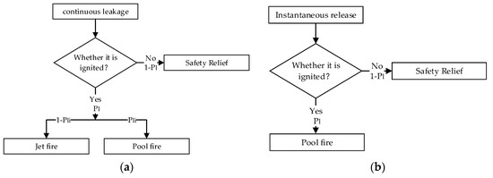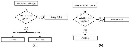 (a) Event tree of equipment failure consequence in case of continuous leakage; (b) Event tree of equipment failure consequence in case of instantaneous release.