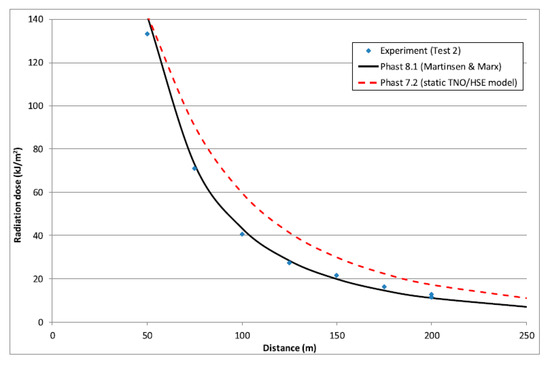 Over the years, the accuracy of PHAST software has been verified by many experts, scholars and institutions at home and abroad [30]. Johnson [31] et al. used PHAST 7.2 and PHAST 8.1 to simulate and analyze the radiation dose of a butane fireball experiment and then compared the simulation results with the experimental data. As shown in Figure 6, the results show that PHAST 8.1 is mostly consistent with the experimental results and the error is very small. Therefore, the simulation results of PHAST software in alkane oil are completely reliable and accurate. When there is no experimental equipment, the software simulation results can replace the experimental results to verify the theoretical calculation results.