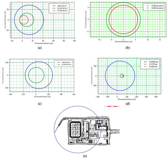 (a) Pool fire with small aperture leakage; (b) flash fire with medium aperture leakage; (c) pool fire with large aperture leakage; (d) vapor cloud explosion with complete rupture; (e) vapor cloud explosion damage radius marked on the station graphic layout.