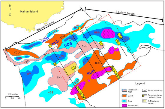 Tectonic units of the Qiongdongnan Basin (modified from [30,31]). The Qiongdongnan basin is divided into the eastern and western basin according to the direction change of the basin axis. Seamounts composed of basaltic volcanic rocks developed in the south eastern uplifts and eastern sags. NDB = Northern Depression Belt. NUB = Northern Uplift Belt. CDB = Central Depression Belt. SUB = Southern Uplift Belt. YCU = Yacheng Uplift. STU = Songtao Uplift. BJU = Beijiao Uplift. YNH = Yanan High. LSH = Lingshui High. LNH = Lingnan High. SNH = Songnan High. YNS = Yanan Sag. YBS = Yabei Sag. SXS = Songxi Sag. SDS = Songdong Sag. LDS = Ledong Sag. LSS = Lingshui Sag. BJS = Beijiao Sag. SNS = Songnan Sag. BDS = Baodao Sag. CCS = Changchang Sag. GQS = Ganquan Sag. HGS = Huangguang Sag.