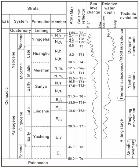Generalized stratigraphic column of the Qiongdongnan Basin (modified from [28,29]).