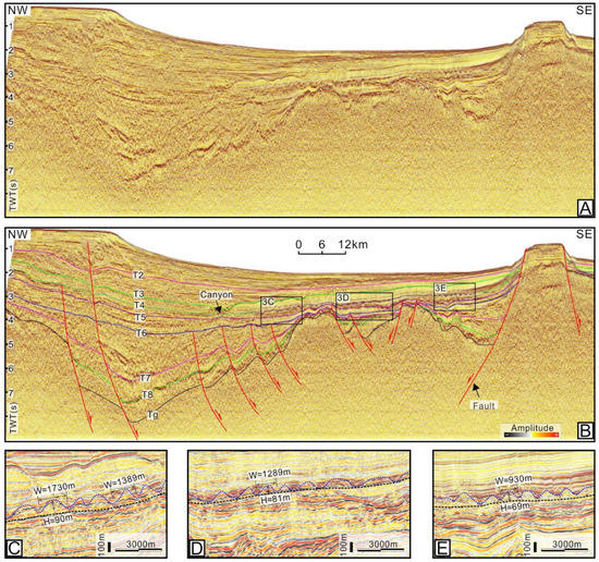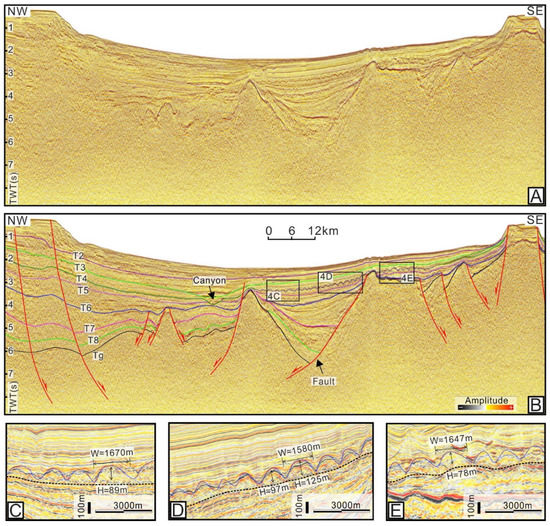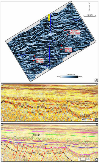 The interpretation of seismic data was carried out by the Geoframe® software (a product of Schlumberger®) to construct the seismic stratigraphic framework. The seismic data were zero-phased and displayed normal polarity, indicating a positive event on the seismic profiles which is shown as a red reflection [25]. The identification of seismic facies differences and contact relationships between strata supported the tracking of sequence boundaries [43]. Eight main seismic sequence boundaries including Tg, T8, T7, T6, T5, T4, T3, and T2 were identified (Figure 3, Figure 4 and Figure 5). Faults can be identified in seismic profiles in the form of the offset of seismic events or zones of poor seismic signal across which reflectors are offset [3,44]. Fault interpretation was conducted by adopting appropriate geometric and kinematic models, e.g., the listric normal fault, domino-type fault, and flower structure [45]. Based on this, the seismic interpretation emphasized describing the geometric characteristics of the mounds within the uppermost layer of the Meishan Fm. The width and height of the mounds and their distribution range were determined based on the 2D seismic profiles. In addition, the isopach map of the Huangliu Fm., prepared based on seismic surfaces T3 and T4, was used to recover the paleogeomorphology corresponding to the end of the Meishan deposition. Moreover, the seismic attribute map of the curvature was extracted by the Geoframe® to reveal the plan-view characters of the mounded topography. Curvature calculates the bending degree of the stratum, which can effectively reflect geomorphic features such as valleys, ridges, and domes [46,47].