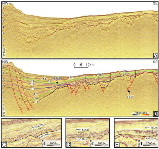 The seismic reflector T4 corresponds to the regional unconformity which represented the Dongsha movement in the South China Sea [16]. In the Southern Slope, the reflector T4 truncated the underlying strata and was onlapped by overlying sediments [4,15], as shown in Figure 3, Figure 4 and Figure 5. The underlying Meishan Fm. can be divided into upper and lower members by an obvious interface. The upper member is characterized by strong-moderate amplitudes, moderate frequency, and mounded reflections, and the lower member shows subparallel sheet-shaped reflections with moderate-strong amplitudes and moderate frequency (Figure 3, Figure 4 and Figure 5). The overlying Huangliu Fm. is dominated by moderate amplitude, moderate-weak frequency, and parallel-subparallel reflections (Figure 3, Figure 4 and Figure 5). The Huangliu Fm. gradually thins onto the southern margin of the basin. A large submarine canyon (Central Canyon) was developed in the post-rift sequence of the QDNB, which is distributed in the Central Depression from west to east (Figure 3, Figure 4, Figure 5 and Figure 6). The large magmatic body between Songnan and Baodao Sags divides the canyon into two sections, the west section trending NE and the east section trending nearly EW (Figure 6).