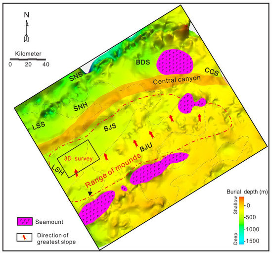 Paleogeomorphology at the beginning of the deposition of the Huangliu Fm., showing the directions of the greatest slope in the southern area. The red dashed line indicates the range of the mounds. LSS = Lingshui Sag. BJS = Beijiao Sag. SNS = Songnan Sag. BDS = Baodao Sag. CCS = Changchang Sag. LNH = Lingnan High. SNH = Songnan High. BJU = Beijiao Uplift.