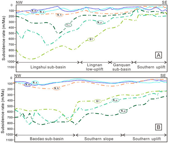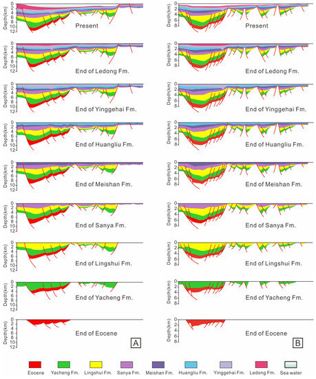 The balanced cross-sections were created by using the backstripping technique to determine the tectonic subsidence in different stages [48,49]. The result shows that the sedimentary centers were controlled by the boundary faults in the Paleogene, during which the sedimentary thickness and subsidence rate in the depression centers are larger than those in the uplift belts (Figure 8 and Figure 9). The Eocene is relatively thin and the subsidence rate is low. The sedimentary thickness and subsidence rate in the early Oligocene significantly increased. The sedimentary thickness in the late Oligocene is relatively thick while the subsidence rate decreased. The faults were almost inactive when the basin entered the post-rift stage and its evolution was mainly controlled by thermal subsidence (Figure 8). During the depositional period of Sanya and Meishan Fms., the sedimentary thickness is relatively thin and the subsidence rate was extremely low, with an average value of less than 150 m/myr (Figure 9). In addition, there was little difference in tectonic subsidence between the Central Depression and the Southern Slope. During the deposition of the Huangliu Fm., the sedimentary thickness increased slightly and the subsidence rate in the Central Depression was ~200 m/myr and gradually decreased southward (Figure 9). During the depositional period of the Yinggehai Fm., sedimentary thickness and subsidence increased sharply, with a maximum cumulative rate approaching ~1100 m/myr in the Lingshui Sag and ~1600 m/myr in the Baodao Sag (Figure 8 and Figure 9). The difference in subsidence between the Central Depression and the Southern Slope and Southern Uplift became more obvious. During the deposition of the Ledong Fm., the deposition thickness was still large, and the Baodao and Lingshui Sags had a subsidence rate of ~800 m/myr and ~950 m/myr, respectively (Figure 9). At the same time, the subsidence of the Southern Uplift was much less than that of the Central Depression. Overall, the most obvious feature of the basin is that since 10.5 Ma, the subsidence began to accelerate, showing higher subsidence in the depressions and lower subsidence in the Southern Uplift.
