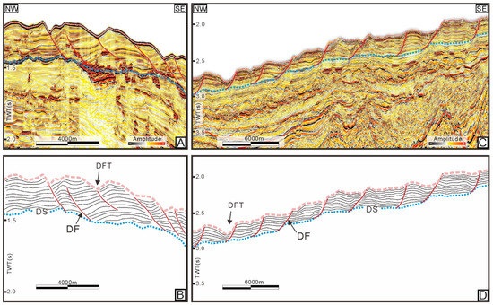(A,B) Seismic profile and its geological interpretation showing the seemingly mounded topography on the seabed caused by submarine landslides in the Shenhu Sea in the northern South China Sea (profile quoted from [40]). (C,D) Seismic profile and its interpretation showing the seemingly mounded topography on the seabed in the Southern Slope (for location, see Figure 1). DS = detachment surface; DF = detachment fault; DFT = downfaulted trough; TWT = two-way traveltime.