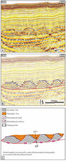 The mounded topography in the study area was previously supposed to be the result of the incision of bottom currents or channels [14,15]. The main evidence supporting this view is that some troughs between the mounds are characterized by high amplitude reflections marking the sand-prone lithologies which may be a clue to the incision [4,14,15], as shown in Figure 3C–E and Figure 7B,C. However, quite a few troughs distributed over a wider area are characterized by weak amplitudes, probably marking the bathyal–abyssal deposits [5,18] (Figure 4C and Figure 5C). Additionally, the internal reflectors within most of the mounds have folded seismic patterns, which might be related to other forces rather than the incision (Figure 3, Figure 4 and Figure 5). Moreover, paleogeomorphology indicated that the seabed over the Southern Slope roughly inclined toward NNW after the deposition of the Meishan Fm (Figure 6). If the troughs were indeed derived from the incision, their axes should have tended to the downdip of slope (NNW) in most situations [21]. However, it is not consistent with the result shown in Figure 7, with most of the troughs tending to be parallel to the strike of the slope (SWW–NEE and SW-NE). These doubts implied that the origin of the mounded topography cannot be simply explained solely by incision. In the examples from the Gulf of Mexico, the Brazilian margin, and the Central North Sea, the undulated morphologies can appear over tectonically active slopes [3,21,22,54,55,56,57]. Similar geological phenomena were observed at the seabed of the Shenhu Sea (Figure 10A) [40] and the south of the QDNB (Figure 10B), featured by seemingly mounded topography related to the disturbance of strata by detachment faults. These phenomena are commonly explained by the gravity gliding of sediments down a slope, which can generate a type of listric detachment fault (flattening downward) with associated rotated blocks to cause seabed relief [21,56,57,58,59]. Such a process can be triggered by rapid deposition, earthquakes, seafloor steepening, and excess pore pressure [58,60]. These studies provided an important insight into discovering the origin of a mounded topography in the study area.