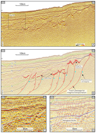 (A) Seismic profile and (B) its interpretation showing the magmatic intrusions associated with the deeply rooted faults (for location, see Figure 1). (C,D) Seismic profile and its interpretation show the dense post-rift faults developed in the eastern depression (for location, see Figure 12A). TWT = two-way traveltime.