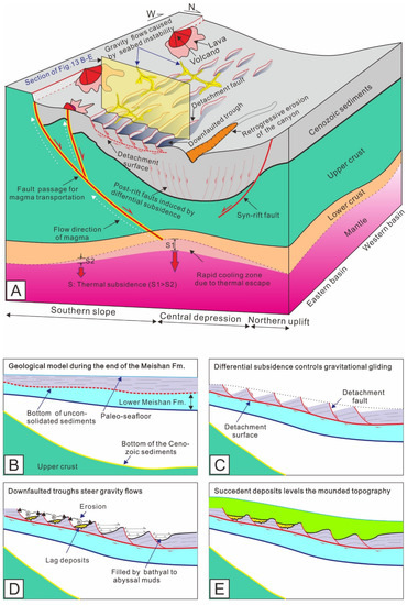 Here, the processes responsible for the formation of mounded stratigraphy are summarized. Firstly, differential subsidence associated with magmatic activities steepened the slope at the end of the Meishan deposition, leading to the gravity gliding of the uppermost unconsolidated layer along a detachment surface (Figure 13B,C). Such a process generated a series of listric detachment faults with numerous tilted fault blocks resting on their fault planes (Figure 13C). The arcuate fault planes and the flanks of blocks together formed the undulated topography. Studies indicated that the denudation of some structural highs in the southern margin at the turn of the middle and late Miocene generated sedimentary sources, which were transported farther into the basin by gravity flows [15]. Then, there might have been some downfaulted troughs steering the gravity flows along their axes, with the unloading of sand-rich deposits at the bottom (Figure 13D). Deposition of other troughs without passing of gravity flows was predominantly from the succeeding bathyal–abyssal muds (Figure 13D). Finally, the Huangliu Fm. onlapped onto and leveled the mounded topography with its final shape adjusted by compaction (Figure 13E). The results of this study do not deny the existence of the erosion of gravity flows, which is also one of the processes that enhanced the relief amplitude of the mounded geometries. It is worthwhile to mention that gravity gliding derived from differential subsidence is decisive for the creation of mounded topography, while erosion and other processes are considered to be of secondary importance and will embellish such topography rather than create it. The differential subsidence associated with magmatic activities led to the development of mounds, which in turn became important clues implying revolutionary changes in tectonic movement that took place at the time equivalent to T4.