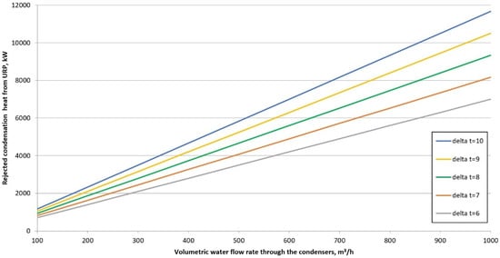 Figure 2 shows the change in heat transfers to water depending on its volumetric flow rate and the temperature difference when flowing through the condensers. The presented graph shows that it is necessary to ensure a high flow of cooling water to reject heat from URP, which is often not ensured in the cooling systems of underground mines. Another critical factor is the temperature of the water. If it is too high, the heat rejection potential decreases.
