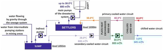 - secondary circuit of chillers’ condensers—circulation of mine water receiving heat.