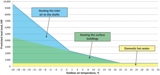 Following the legal requirements in many countries, it is necessary to heat the inlet air to the mine in winter to avoid freezing the shaft hoist elements. The heat demand for air heating in the intake shafts depends on the outdoor temperature and the flow rate of the inlet air into the mine. About 12,000 m3/min of air (240 kg/s) flows through the inlet shaft, where a pipeline discharges water to the surface. The peak power of the air heaters in the inlet shaft at a design temperature of −20 °C is 5.0 MW. The calculations assume that the air is always heated to the temperature of 1 °C required by law, and the heat demand depends on the outdoor air temperature.