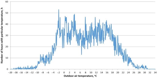 However, the graph presented in Figure 6 does not show the heating demand; rather, it shows only the heat load variability. Therefore, using statistical climatic data for Katowice, changes in heat demand and outside air temperature were analysed. Figure 7 presents the frequency of occurrence of temperatures in the area of the Halemba mine. The presented graph shows that very low air temperatures are relatively rare, and then the thermal loads of the systems are the greatest.