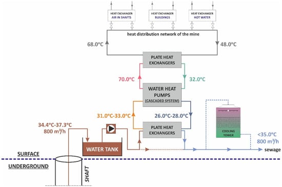 Simplified sketch of the heat recovery solution from the mine water pumped by the dewatering system.