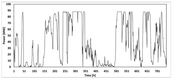 Instantaneous wind power values were provided on an hourly basis by SINTEF for January 2015, as shown in Figure 1. These power values were estimated using wind data collected in the NCS region in 2015 and assuming an imaginary wind farm with a peak power output of 88 MW [19] located in the Tampen area. This wind farm will be used in the future to power offshore oil and gas fields in the area and is, therefore, highly relevant to our study case. Figure 1 is the power generation profile that was used for the current study.