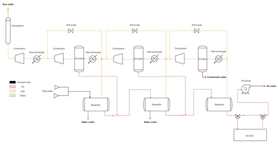 A model of the topside processing system was created using K-Spice SimExplorer Version 4.2.0.0, a dynamic process simulation tool. The employed simulator is a multipurpose dynamic process simulator used for the system design of oil and gas processing facilities from FEED phases to startup and during operations. The simplified process flow diagram of the model is shown in Figure 2. It consists of a typical three-stage gravity separation process to separate oil, gas, and water with compression with interstage cooling and gas scrubbing. Gas and oil export systems are included. In addition, an antisurge loop was designed for each stage to prevent the compressors from being overloaded or surging. Performance curves for the compressors were considered. Other systems such as oil stabilization, gas dehydration, and water treatment were not included because their energy usage is small compared with that of the rest. Each stage was operated at different pressure levels to induce separation. The separators had identical dimensions. Since the first two separators were three-phase separators, water, oil, and gas were separated, whereas the third one was a two-phase separator that only separated oil and gas. Table 1 presents the key properties of the model.