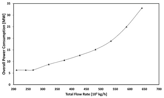 The total inlet production rate of the process was varied in order to determine the variation in the total power consumption of the system. The total inlet production rate was varied within operationally feasible limits (e.g., values corresponding to plateau/peak production and abandonment). There was no change in the composition of the inlet fluid (therefore, the produced gas/oil ratio and water cut remained constant). The results are shown in Figure 3 and Table 2. The total power consumption ranged from 33.06 MW (this is equivalent to 641.4 × 10 kg/h production) to 6.37 MW (this is equivalent to 267.3 × 10 kg/h production). It is possible to operate the facility at a lower rate, but the power consumption remains the same, as shown in Figure 3 and Table 2. Assuming that the processing facility is powered only by fluctuating power sources, such as wind power, the production rate must be adjusted so that the power requirement of the process matches the available power from the wind power facility. This adjustment must occur over a period of hours, as opposed to the gradual changes in oil and gas fields experienced by offshore installations over months and years.