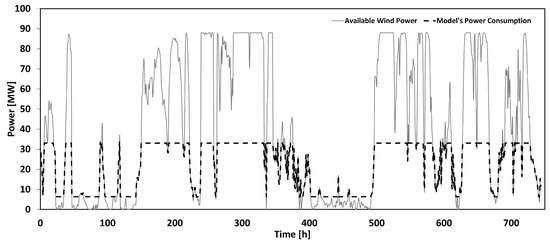 - When the available wind power was below the minimum power threshold of the processing facility (6.37 MW), the power consumption was set to this value. Thus, the available wind power could not meet the requirements of the system, and a production stop was also not considered as an option. An alternative power supply was assumed to maintain the minimum required power.