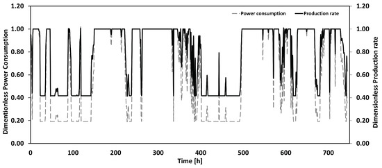 The profile of power consumed by the processing facility was employed to calculate the production rate profile. This was performed by doing a piece-wise linear interpolation on the data points presented in Table 2. The results are plotted in Figure 5. It illustrates the close relationship between changes in power consumption and the production rate.