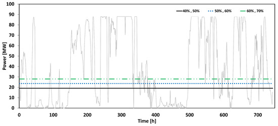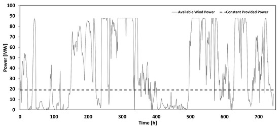Figure 4 shows the value of power consumed by the processing facility and the power produced by the wind farm in time, on an hourly basis for a period of one month. There was a considerable number of hours during which the available wind power either exceeded the maximal required value or did not reach the minimum required value. This indicates that the amount of power provided fluctuated significantly and that the power supply was very unreliable.