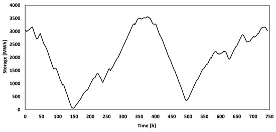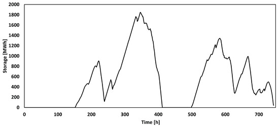 For this method, optimization should be performed at times only when the wind power exceeds the constant power value. Consequently, the first 150 h of power shortage given in Figure 1 were neglected and assumed that only gas turbines were operated in this time window. There is another gap interval after tracing the storage value when there is insufficient storage (from time 413 to time 500). Therefore, the optimization process was repeated twice in order to determine the most optimal amount of power that can be supplied. An approximately equal amount of provided power was sought for both intervals in the optimization. As a result, there are two intervals of 263 h (from time 150 to time 413) and 244 h (from time 500 to time 744), providing 32.4 MW, respectively, as shown in Figure 12. Furthermore, this value is equivalent to productions of 638.4 × 10 kg/h. Gas turbines can be used as an alternative to the two gaps, which are shown in Figure 12, from time 0 to time 150 and from time 413 to time 500.