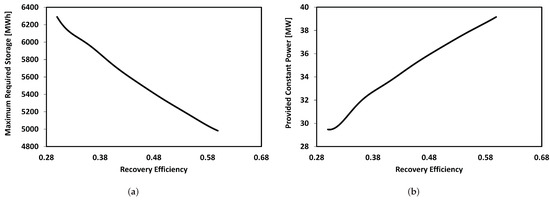 Sensitivity analysis of energy storage size and constant power with recovery efficiency, . (a) Maximum required storage. (b) Provided constant power.
