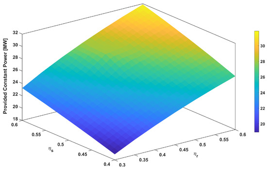 Then, the sensitivity of two parameters, the provided constant power, and the maximal required storage, was also assessed with both efficiency values, and , as shown in Figure 10 and Figure 11. Both efficiency values and the constant provided power are positively correlated. The result is as expected: higher efficiency values achieved in the storage and recovery of power can lead to higher power output. However, by increasing the recovery efficiency and decreasing the storing efficiency, the maximal storage requirement can be reduced. In other words, the size of the storage is reduced if we are able to use most of the stored power (higher recovery efficiency) or if we are not able to store as much power (lower storing efficiency).