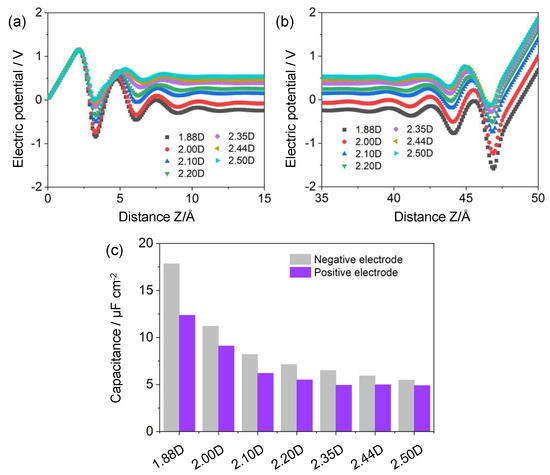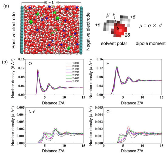 Figure 4a represents the electric potentials as a function of distance z from the electrified electrode surface. The electric potential ϕ(z) displayed a remarkably oscillatory behavior in the proximity of electrodes, and progressively grew smooth with the increasing z. Specifically, the magnitude of electrode potential was monotonically extended by enlarging the solvent dipole moment from ~1.88 to ~2.50 D. This trend was intimately correlated with the aforementioned ionic distributions, where a higher ion density facilitated a more rapid screen of interfacial electric fields, and thereby resulted in a lower electrode potential drop. Similar results were also observed on the positive counterpart (Figure 4b).