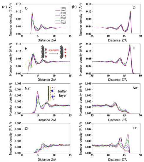 Figure 1b displays the density profiles n(z) of electrolytes nearby the uncharged graphene electrodes. Obviously, multilayer structures of electrolytes were observed at the interface, primarily owing to the strong interfacial VDW interactions. Specifically, the first layer of cations preferentially gathered at the valley of neighboring O atoms, in which they could maintain a complete hydration shell, whereas anions preferred to accumulate farther away from the electrified surface, probably due to the hydration effects. Nonetheless, the oscillatory patterns of the density profiles vanished about ~10–12 Å away from the electrode surface, which is in good agreement with the classic Gouy–Chapman–Stern model.