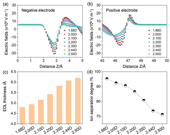 However, in this work, the as-obtained trend was principally attributed to the descended interfacial electric fields stimulated by the strong-polarity solvents in the proximity of electrodes, instead of the volume-excluded effects. Owing to the strong solvation strengths of inorganic ions, a buffer layer of solvents was usually maintained between the electrified surface and solvated ions (see the orange rectangle in Figure 2a), which effectively prohibited the electrolyte ions from approaching the electrodes directly. Considering the dielectric nature of solvents, they could noticeably screen the interfacial electric fields and thus diminish the ion–electrode interactions, which became more pronounced within the stronger-polarity solvents. Therefore, the ion populations at the interface were compressed significantly and monotonically with the increasing dipole moment. Such a phenomenon could be validated well by the interfacial electric field distributions (Figure 3a,b). Owing to the superior screening efficiency of strong-polarity solvents with higher monomeric charges, the electric field strengths in the vicinity of ion layers were decreased significantly by ~225.8% with the increment of dipole moment. Similar electrolyte distributions were also observed on the positive graphene counterpart (Figure 2b). The interfacial EDL multilayer structures almost vanish when the distance to the graphene electrode is increasing beyond ~10 Å because van der Waals interactions are short-ranged and electrostatic interactions are screened by ions and solvents.