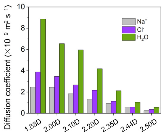 Figure 4c illustrates the specific capacitances for the cathode (Ccathode) and anode (Canode). The as-calculated capacitances at the negative and positive polarizations of ~2.35 D were ~6.50 and ~4.93 μF cm−2, respectively, which are in good agreement with prior theoretical and experimental studies. For instance, using an MD simulation, Xu and colleagues pointed out that the specific capacitances were ~6.32 and ~6.04 μF cm−2 at the negative and positive polarizations of graphene electrodes, respectively [29]. In another experimental study, a representative capacitance value of ~8–10 μF cm−2 was observed for the carbon electrodes immersed in a neutral NaCl solution [30].