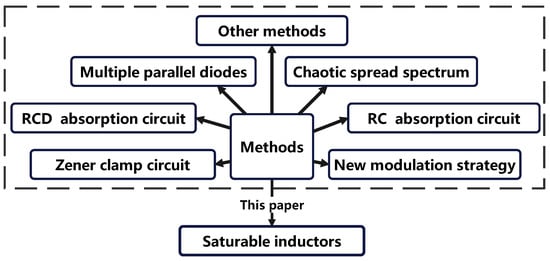 In order to solve the short circuit problem caused by the high-frequency voltage oscillation and voltage spikes, many methods have been proposed. For example, some have adopted the RC absorption circuit in the converter [23]. When the switch is turned off, the energy accumulated in the parasitic inductor charges the absorption capacitor to suppress the voltage surge. However, parameter design of RC absorption circuit is difficult, and inappropriate parameter design will increase the power loss of the circuit, and it cannot achieve the expected ripple suppression. Some have used the RCD absorption circuit in the converter [9,23]. When the switching voltage rises to the voltage of the absorption capacitor, the absorption diode is turned on, so the switch is embedded by the diode. However, the diode of the RCD absorption circuit has large power loss and RCD absorption circuit is not suitable for the absorption of diode reverse voltage spike, because it may exacerbate the diode reverse recovery current. Some have employed the Zener clamp circuit [24,25], which adds the Zener diode at the primary or secondary side. The voltage of the Zener diode aggravates the clamped below the maximum voltage when the current rises. However, the rapid conduction of Zener diode will exacerbate EMI problem. Some researchers proposed the chaotic spread spectrum technique [20,26]. It utilizes the wide spectrum characteristics of chaotic signals to distribute the energy to a wider continuous frequency band, so as to achieve EMI suppression. Some scholars put forward that the understanding of the DCM resonance mechanism is the key to fulfilling ZVS and ZCS simultaneously [27]. Some researchers proposed the new modulation strategy without introducing an auxiliary circuit [28]. However, these methods generally are complex and lack of practicability. Some researchers introduce an auxiliary current source network to realize the zero-voltage turn-on of the lagging bridge arm, but it is complex [29]. Some proposed FFM modulation-based soft-switched isolated SRC to reduce the conduction losses by blocking the reverse current [30]. Figure 1 shows the methods used in resolving voltage oscillation and voltage spike problems.