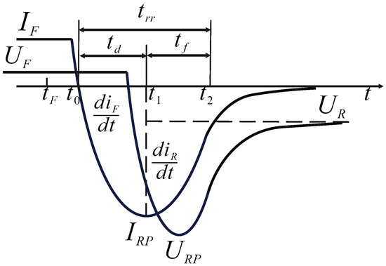 After , the rapid decline in reverse current results in a high value of . Then, due to the influence of inductance, reverse voltage spike is generated. The spike may reach more than three times the voltage at the secondary side.