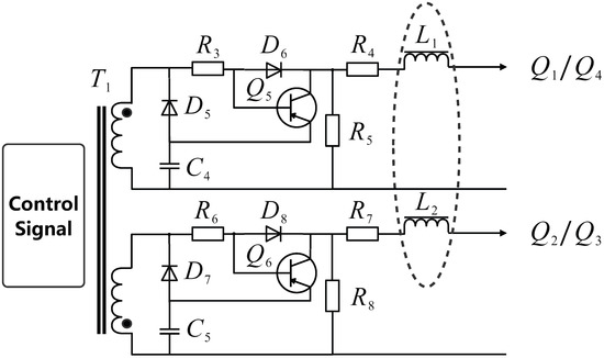 In Figure 7, capacitors and are equivalent to voltage sources to achieve rapid turn-off together with the transistor and . and are saturable inductors. The drive circuit outputs the PWM signal to when receiving the control signal. Compared with the drive circuit of traditional FB-ZVS PWM, saturable inductors and are used before the output drive signal to reduce high-frequency interference signal peak, which causes the short-circuit problem of the power tubes. Its mechanism is the same as diode peak suppression. Both of them make use of the characteristics of the saturable inductor to inhibit current growth.