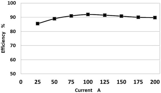 Figure 9 presents the efficiency curve of the converter. As the power increases, at half load, the efficiency of the power supply reaches . When the current is 200 A, due to the increase of conduction loss, the efficiency of circuit declines, but it is still approximately .