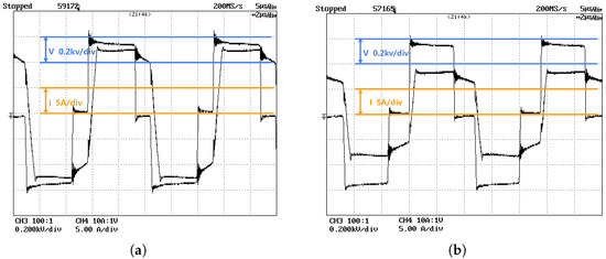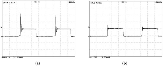 Figure 10a shows the driving voltage waveform without saturable inductors. Figure 10b shows the driving voltage waveform with saturable inductors. Figure 11a shows the voltage waveform of the rectifier tube without adding saturable inductors when = 200 VAC. Figure 11b shows the voltage waveform of the rectifier tube after adding saturable inductors. In Figure 10a, the high-frequency on–off switch brings serious EMI problems to the drive signal. In Figure 11a, the peak value is more than twice the normal value. After adding saturable inductors, as shown in Figure 10b and Figure 11b, interference and voltage spikes are effectively suppressed.