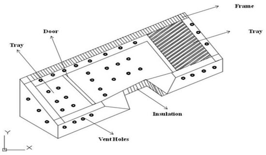 The five basic components of a forced convection greenhouse drying system are: a drying chamber; a tray to contain the product that needs drying; an inlet hole; an outlet hole adjusted with a fan or blower for air circulation; and for a continuous steady power supply, a battery charging system is required. The heated air passing over the wet product facilitates moisture evaporation due to the convective heat transfer mode [57]. The difference in moisture concentration between the crop surface and dry air causes drying [58].