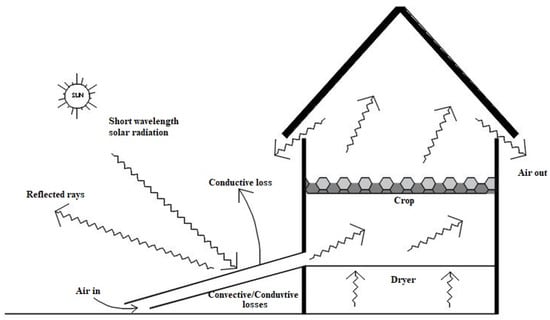 Solar radiation incidents on the transparent glass cover are easily transmitted into the cabinet of the dryer. Most of the radiation is transmitted into the cabinet of the dryer, and the remaining part of the radiation is reflected back. The crop surface reflects part of the radiation, and the remaining part is absorbed by the crop surface, which thus increases the temperature of the crop. The heated crop starts emitting long-wavelength radiation, but the long wavelength radiation cannot escape into the atmosphere due to the presence of the glass walls and cover; thus, the presence of both the incidental and reflected radiation within the chamber further increases the temperature to be higher than that of the crop [12]. Figure 2 illustrates a direct solar drying system.