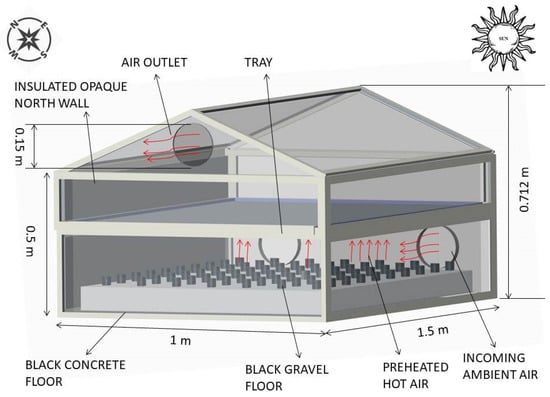- Chauhan, P.S.; Kumar, A. Heat transfer analysis of north wall insulated greenhouse dryer under natural convection mode. Energy 2017, 118, 1264–1274. [Google Scholar] [CrossRef]