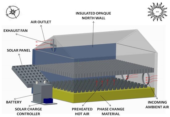 Greenhouse dryer with a PCM on the north wall [19].