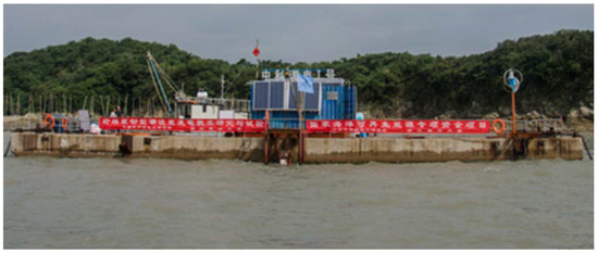 The tidal power generation platform “Zhongke Hydropower No. 1” built by the Institute of Electrical Engineering of the Chinese Academy of Sciences in Zhoushan, Zhejiang Province, is shown in Figure 2. A maximum of 20 kW of electricity can be generated by the platform, which uses two tidal power generation devices to harness the tidal power of nearby seas in real-time. The platform for generating tidal power is also outfitted with a full tidal current detection system, which can track and record characteristics, including tidal current speed, flow direction, output voltage, current, and power in real-time.
