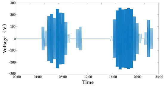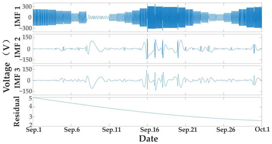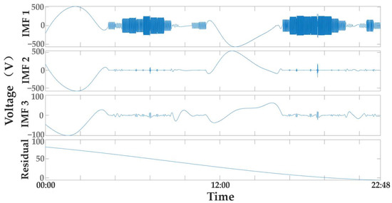 The output power data of the tidal energy generator set throughout the day are shown in Figure 3. The output voltage of the motor changes throughout the day in Figure 3. Voltage surges and drops occur throughout the generator operation, and voltage interruptions occur during motor stalls. Next, the EMD decomposition of the signal in Figure 3 is shown. The first three IMFs were taken for analysis, as shown in Figure 4. It can be seen in Figure 4 that the signal’s symmetry causes the signal’s primary modes to be concentrated in IMF1. A residual function that is monotonically decreasing is the outcome of the EMD decomposition.