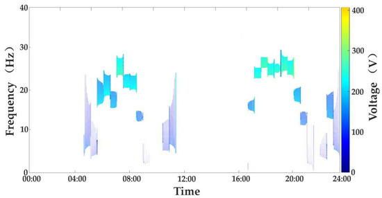 In conclusion, the motor ran for 14 h and then idled for 10 h. The highest voltage was 259 V, and the frequency was 28 Hz, as can be seen in the Hilbert spectrum, which shows that the duration of the motor operating for a day, the duration of halting, and the duration of the maximum voltage appearing are consistent with Figure 3.