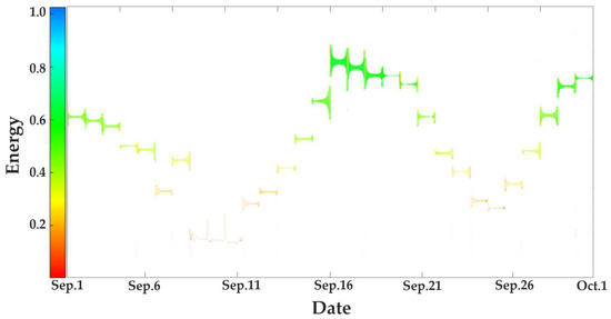 - From 16 September to 24 September, the color gradually shifts from light green to yellow and then from yellow to red as the curve steadily declines, showing a gradual decline in energy before a sudden decline in daily power generation;