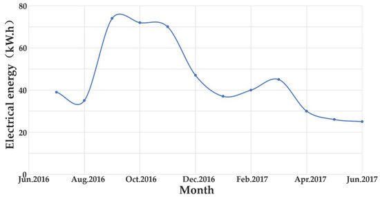 The yearly distribution pattern of the system is shown in Figure 10 based on the measured power generation data of the tidal power generating system in 2016–2017, where the horizontal coordinate corresponds to the current month, and the vertical coordinate represents the system’s monthly power generation.
