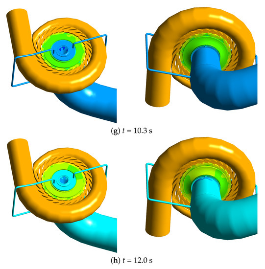 In the load rejection process, the flow of the fluid passages shows extremely unstable turbulent characteristics (Figure 7). At the starting moment (t = 0 s), when the unit works under the full load, the pressure distribution of the unit is relatively stable. From t = 3.4 s, the guide vanes start to close, and the pressure in the spiral case passage is increased due to the water hammer effect. The pressure in the draft tube is also affected by the water hammer effect. The pressure distribution of the crown chamber and band chamber becomes nonuniform, which affects the vibration of the head cover and bottom ring significantly.