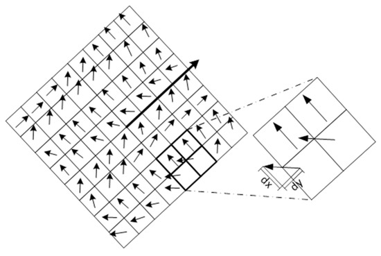 As a first step to obtaining the SURF descriptor area, it is necessary to build a window around the points of interest. This window consists of the pixels that make up the entries in the descriptor vector. The default size of this window is 20 pixels. The window is divided into a descriptor of 4 × 4 regular subregions. In each of these subregions, regularly spaced samples of points are determined using the Haar wavelet, from which gradients, local minima, and local maxima are examined. The relative and absolute values of the dx and dy vectors shown in Figure 3 are used to gather information for each subregion.