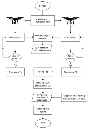 A novel approach is to use two independently operated cameras mounted on unmanned aerial vehicles that collect video footage from two remote points in the city. A schematic of the automatic object detection algorithm used and the comparison of the analysis results to the data collected through the Google Distance Matrix API is shown in Figure 4. The purpose of this study is to propose a method for analysing data on the current traffic situation using real images from cameras mounted on UAVs. The study using two drones was conducted at different times of the day considering peak traffic hours and holidays.
