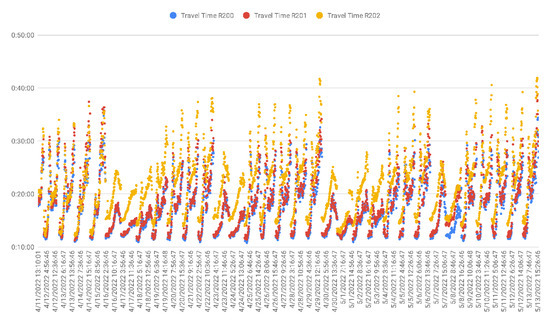 After collecting travel time proposal data from Google’s servers, an attempt was made to find a formula and method to determine travel time based on the actual traffic data in the city. Data from Google Cloud Processing was collected from February to May 2022 on many different routes simultaneously. Figure 7 shows the predicted travel time for only three selected routes leading to the same destination following different intermediate points (it can be observed how much information is collected in just one month).